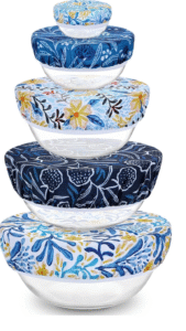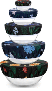 - 5 beeswax bowl covers (4″, 5″, 8″, 10″, and 12″), each with a unique design for stylish food storage.